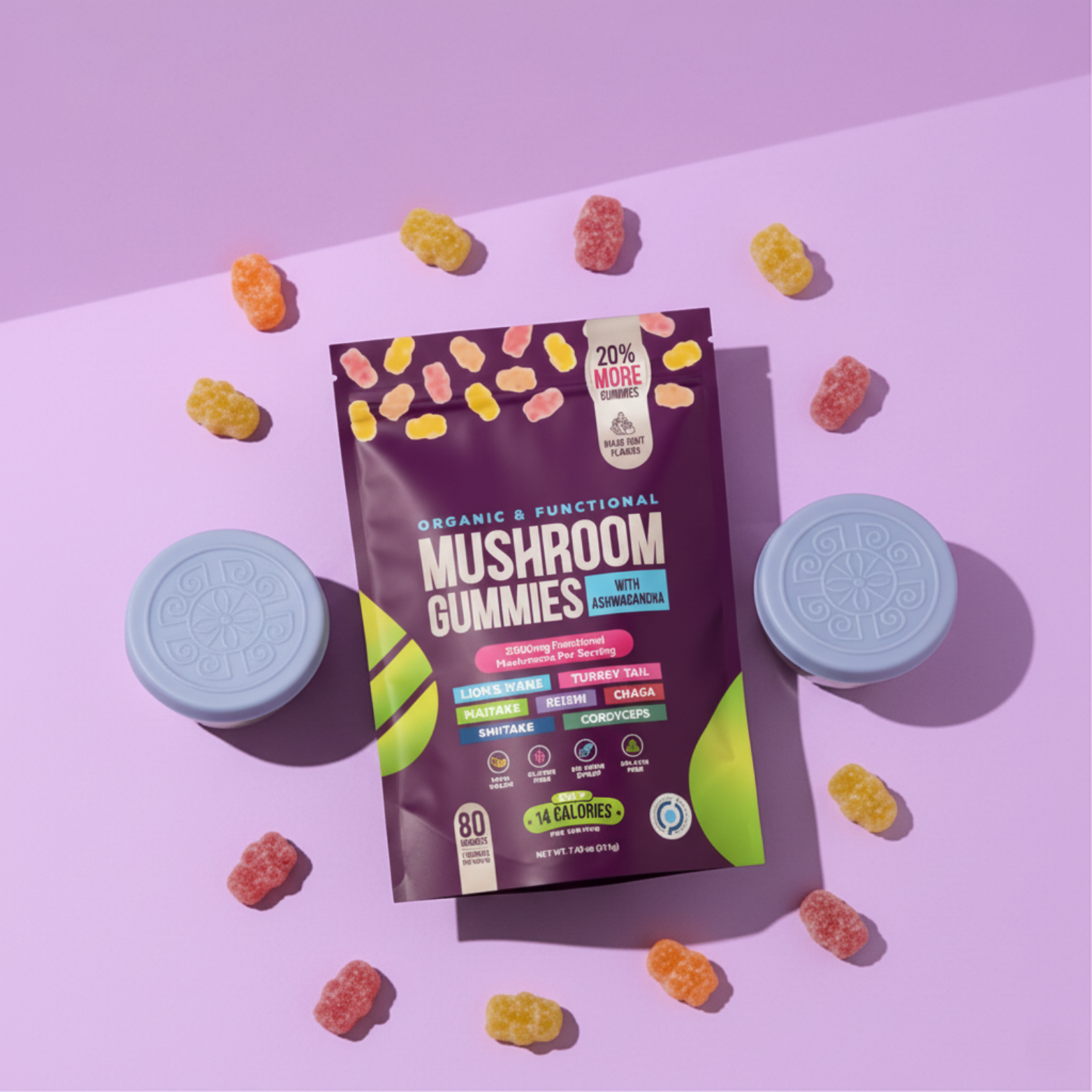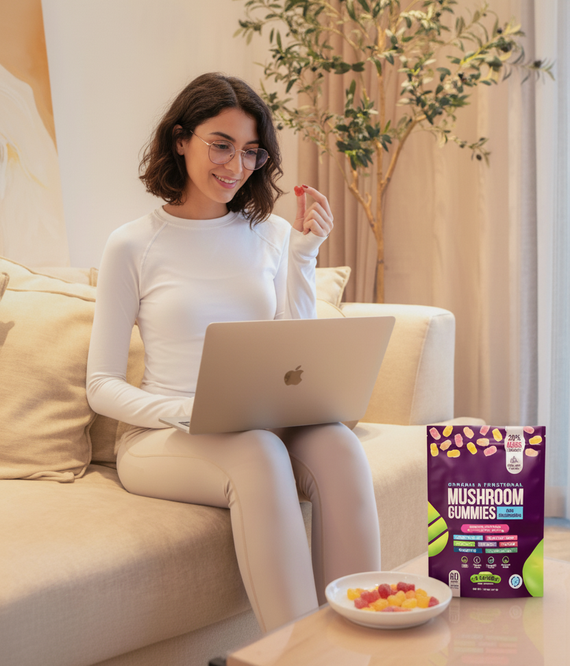 הגומי מכיל שילוב של פטריות פונקציונליות כמו ריישי, רעמת האריה וצ’אגה, שנחקרו רבות בהקשר של חיזוק מערכת החיסון, תמיכה בריכוז ואנרגיה טבעית. כך אתה מקבל בוסט בריאותי בלי קפאין ובלי התרסקות.